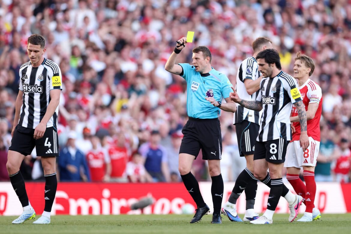 LONDON, ENGLAND – APRIL 25: Sven Botman of Newcastle United and Declan Rice of Arsenal battle for possession during the Premier League match between Arsenal and Newcastle United at Emirates Stadium on April 25, 2026 in London, England. (Photo by Mark Thompson/Getty Images)