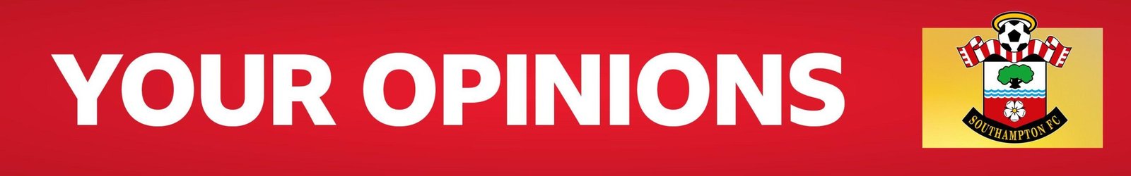 A banner which says "your opinions" in white writing on a red background with Southampton's club badge over a yellow square background on the right