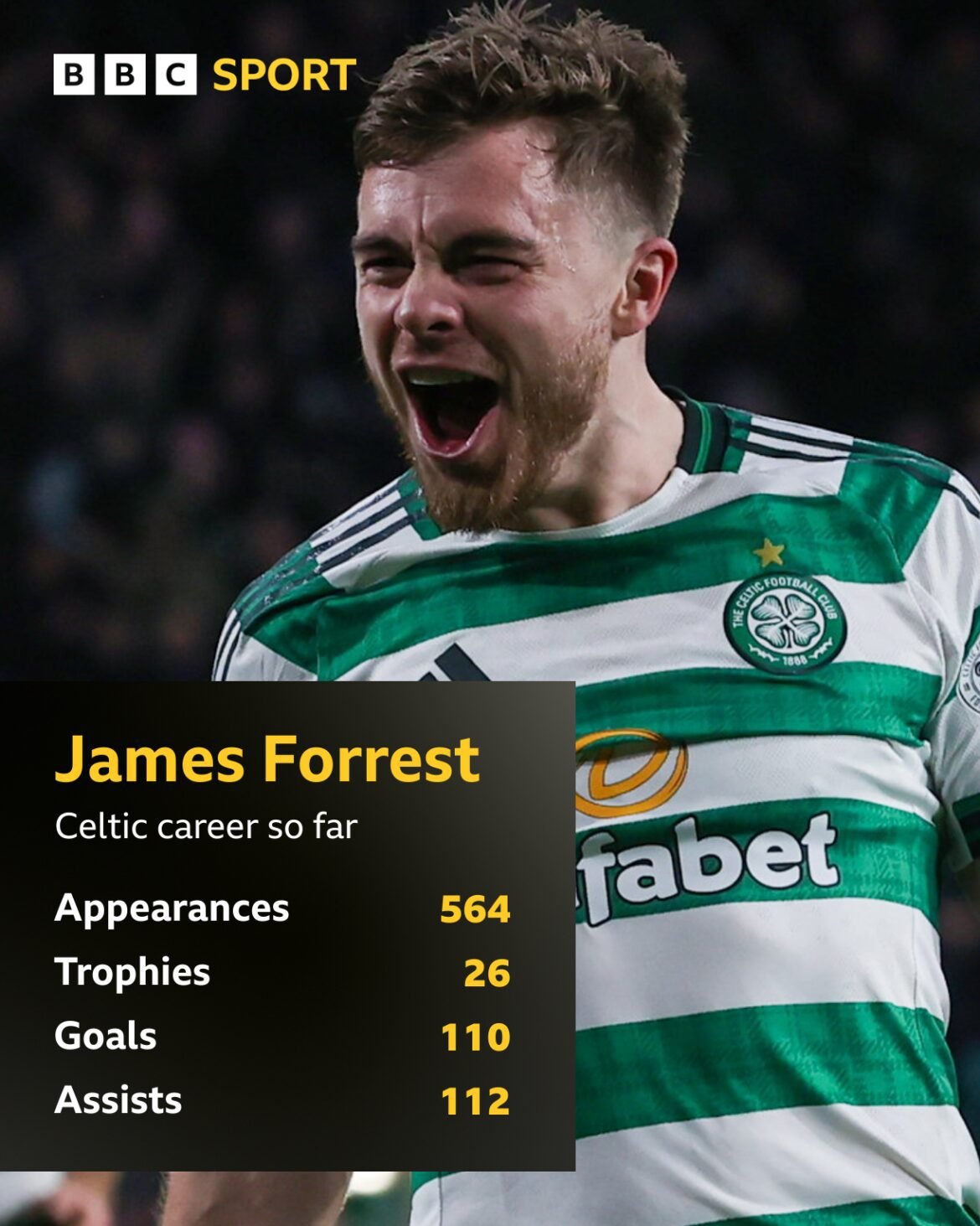 That was the 110th goal of Forrest's Celtic career and his impressive, game-changing Scottish Cup semi-final cameo against St Mirren last weekend was his 564th appearance for the club. In setting up Kelechi Iheanacho's extra-time goal, Forrest took his assists haul to 112.