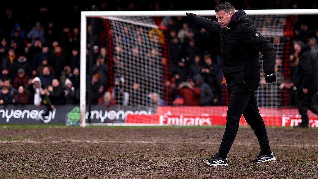 Rob Edwards walks across the muddy pitch at Blundell Park and acknowledges the travelling Wolves fans