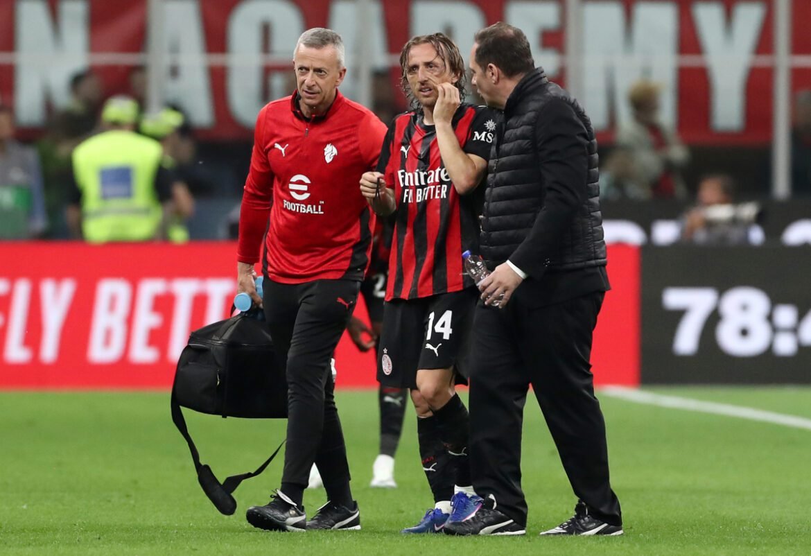 MILAN, ITALY – APRIL 26: Luka Modric of AC Milan is assisted off by medical staff after going down injured during the Serie A match between AC Milan and Juventus FC at Giuseppe Meazza Stadium on April 26, 2026 in Milan, Italy. (Photo by Marco Luzzani/Getty Images)
