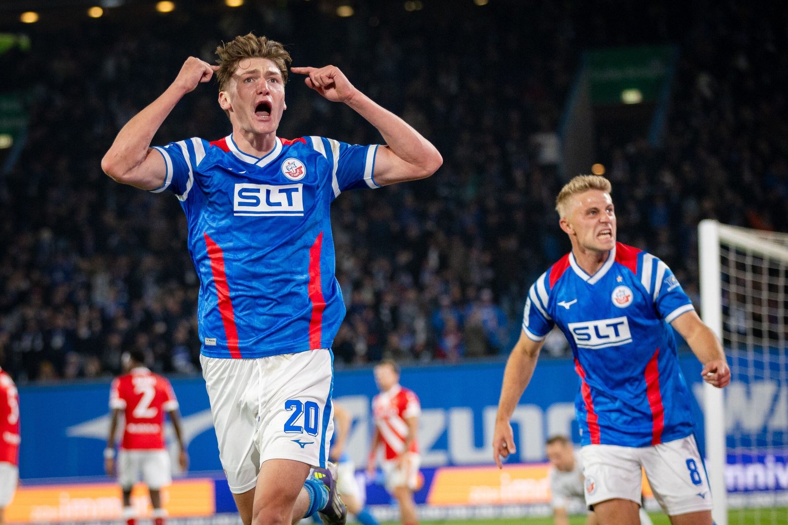 ROSTOCK, GERMANY – SEPTEMBER 30: Ryan Naderi of Hansa Rostock celebrates with teammate Cedric Harenbrock after scoring his team’s first goal during the 3. Liga match between Hansa Rostock and FC Energie Cottbus at Ostseestadion on September 30, 2025 in Rostock, Germany. (Photo by Inaki Esnaola/Getty Images)