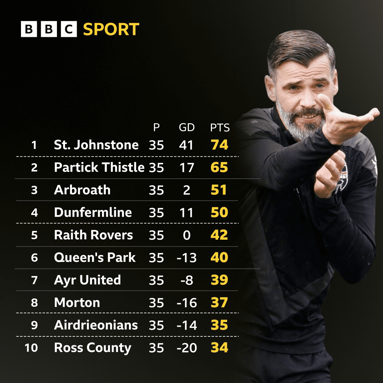 Airdrieonians are on 35 points with a minus 14 goal difference and Morton are on 37 with a minus 16 goal difference.