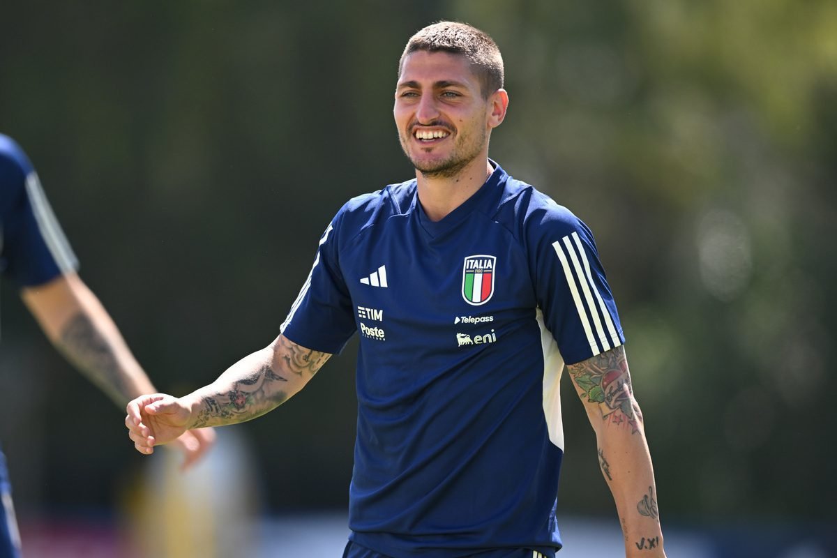FLORENCE, ITALY – JUNE 07: Marco Verratti of Italy warms up during training session at Forte Village Resort on June 07, 2023 in Santa Margherita di Pula, Italy. (Photo by Claudio Villa/Getty Images)