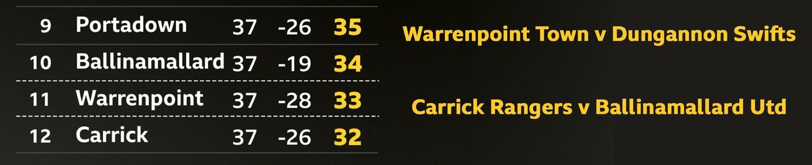 Carrick were bottom of the table and one point off Warrenpoint in 11th, while Ballinamallard were in 10th and out of the drop zone, again by one point.