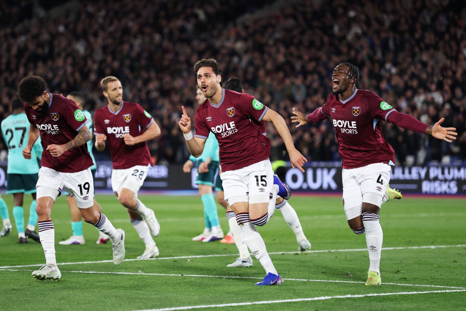 LONDON, ENGLAND – APRIL 10: Konstantinos Mavropanos of West Ham celebrates his second goal during the Premier League match between West Ham United and Wolverhampton Wanderers at London Stadium on April 10, 2026 in London, England. (Photo by Mark Thompson/Getty Images)