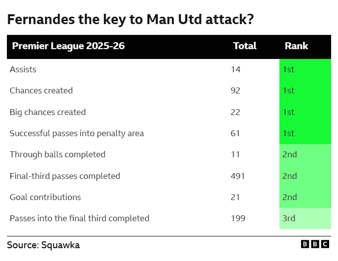 Table graphic showing Bruno Fernandes Premier League rankings for this season: Assists - 14 (1st) Chances created  - 92 (1st) Big chances created - 22 (1st) Successful passes into penalty area - 61 (1st) Through balls completed - 11 (2nd) Final-third passes completed - 491 (2nd) Goal contributions - 21 (2nd) Passes into the final third completed - 199 (3rd)