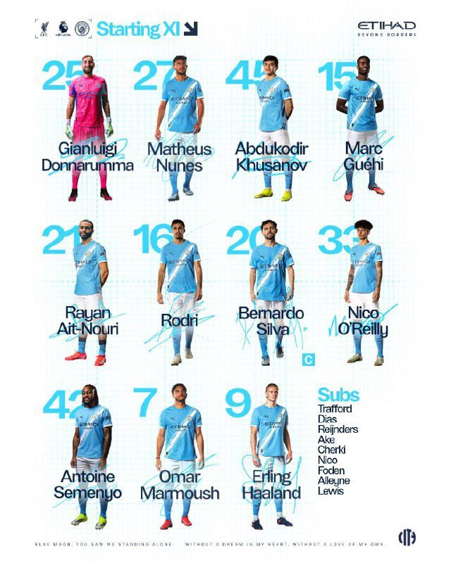 XI | Donnarumma, Nunes, Khusanov, Guéhi, Ait-Nouri, Rodri, Bernardo (C), O’Reilly, Semenyo, Marmoush, Haaland